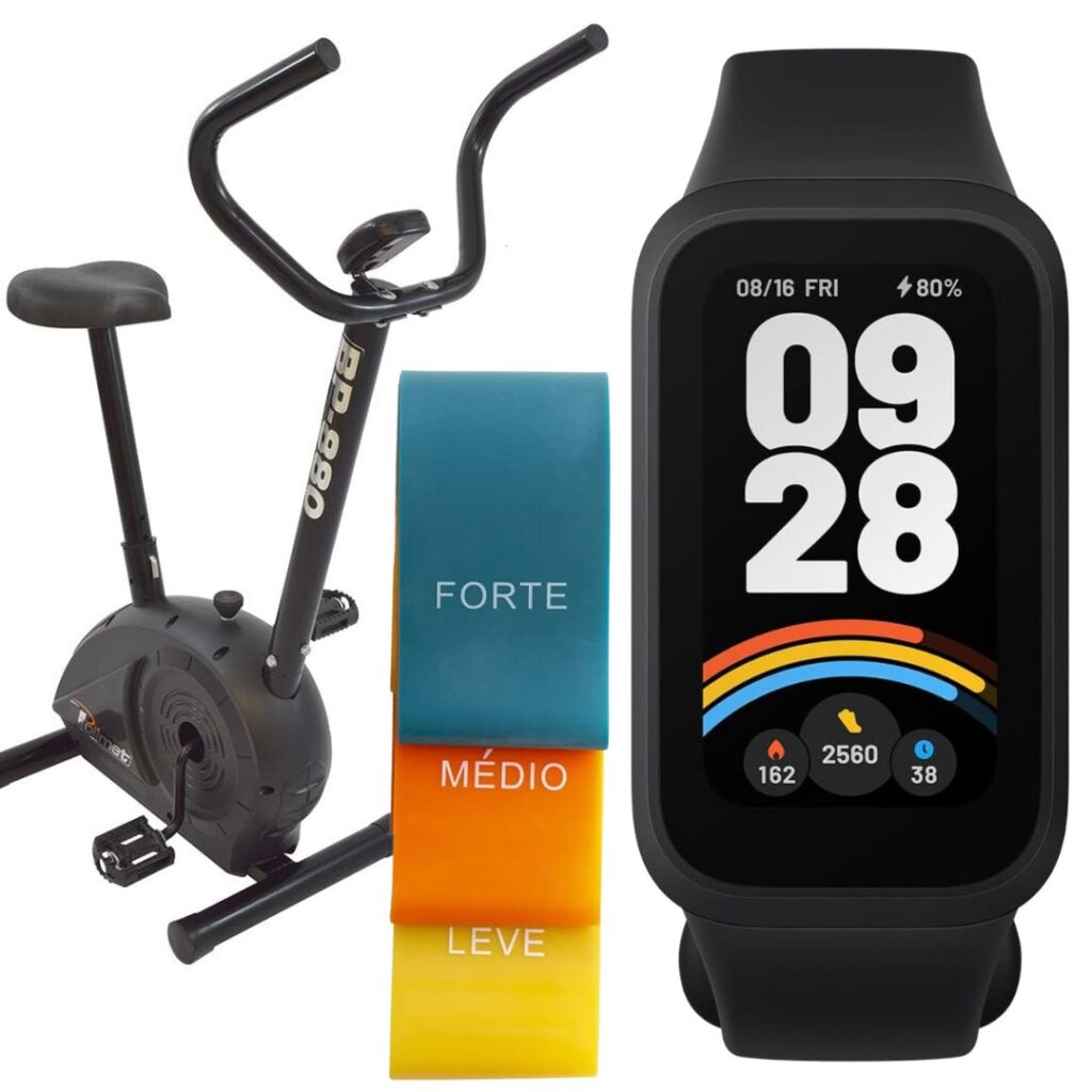 Smart Band Xiaomi – Esta pulseira inteligente monitora seus exercícios, inclusive sua frequência cardíaca e saturação de oxigênio, trazendo mais informação sobre seus treinos caseiros para você ter melhores resultados.